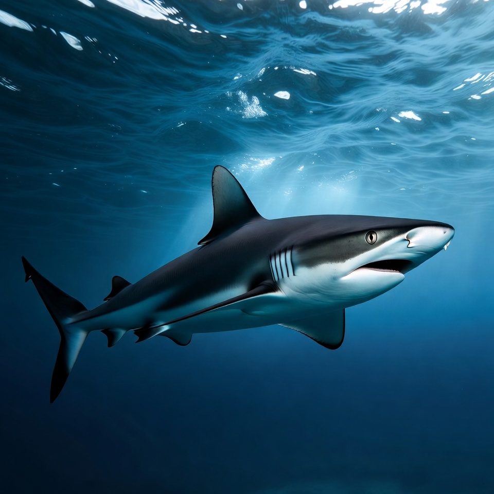 A blacktip shark swims through clear blue ocean water with rippling surface light above. The shark has a sleek black body with white underbelly and prominent dorsal fins. Its mouth is open, revealing sharp teeth, as it glides gracefully in the underwater scene.