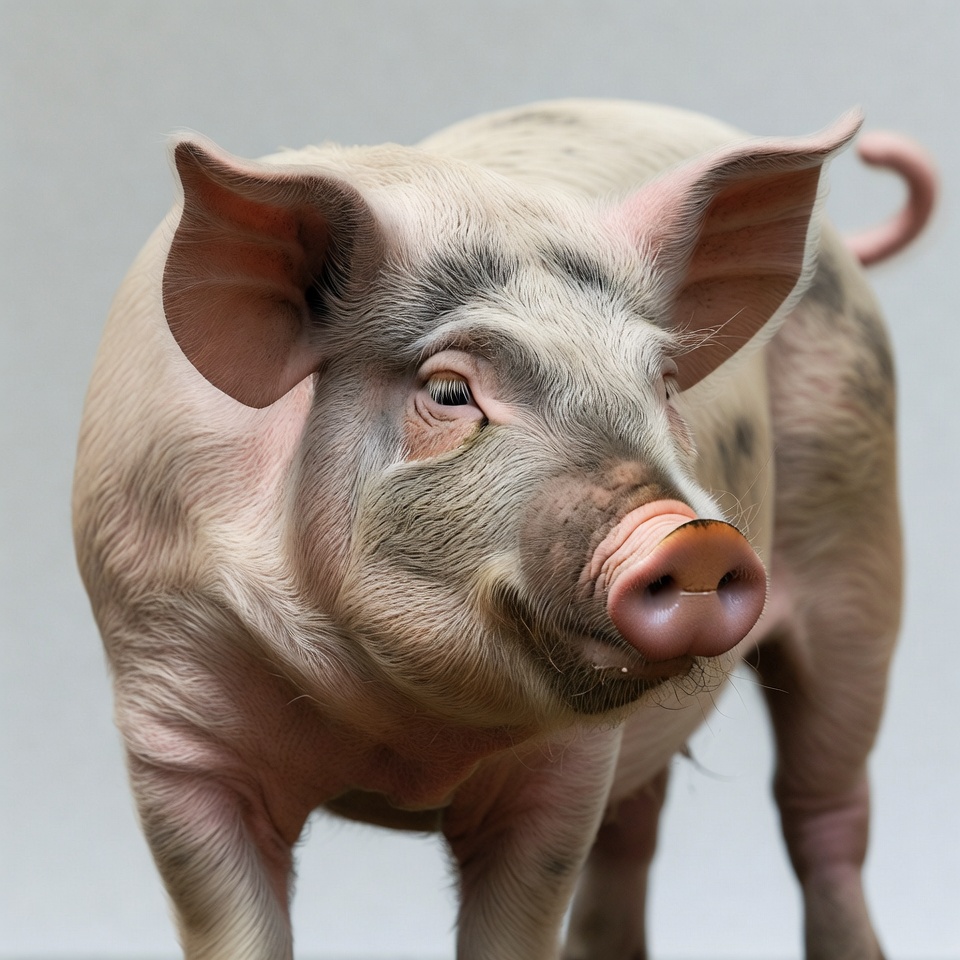 animal portrait, curly tail, cute pig, domestic pig, farm animal, floppy ears, isolated background, livestock, pig face, pink pig, snout, spotted pig, white background, young pig, pig