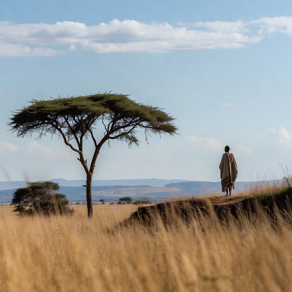 A man wrapped in a traditional shawl stands on a grassy hill overlooking the vast golden savanna. A large acacia tree with wide branches is positioned nearby under a clear blue sky with scattered clouds. Distant trees and hills frame the expansive African landscape.