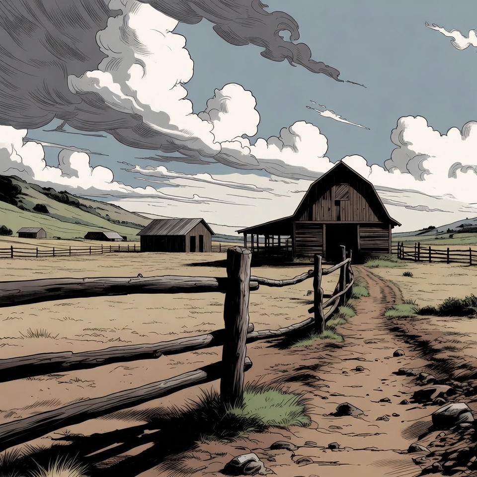agriculture, clouds, countryside, dirt path, drawing, farm, farm building, fields, grass, hills, illustration, pasture, rural landscape, rustic barn, scenery, sky, wooden barn, wooden fence, barn