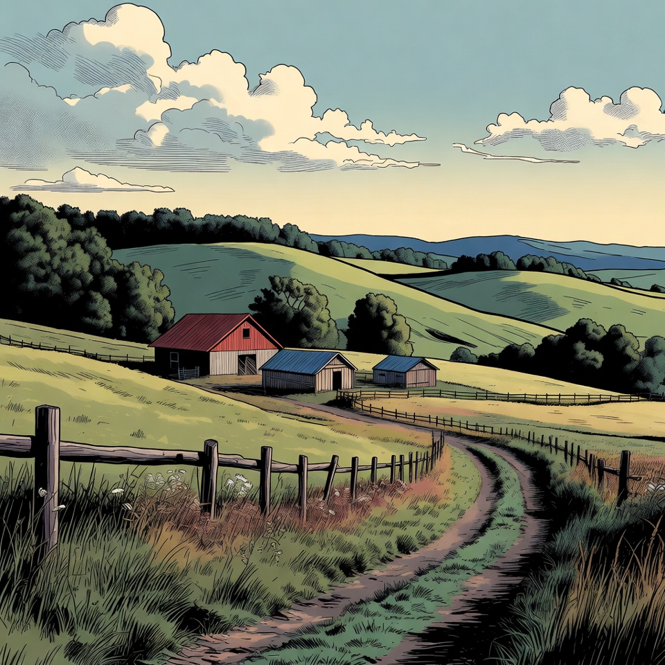 An illustration depicts rolling green hills with scattered trees under a sky filled with fluffy clouds. Red and blue barns sit amidst the fields, connected by a winding dirt path lined with wooden fences. Golden grass borders the path in the foreground.