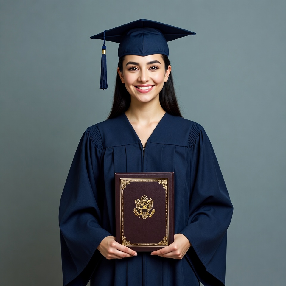 A young Latina woman with long dark hair smiles while wearing a navy blue graduation cap and gown. She holds a large burgundy diploma with gold emblem in her hands. She stands against a plain gray background.