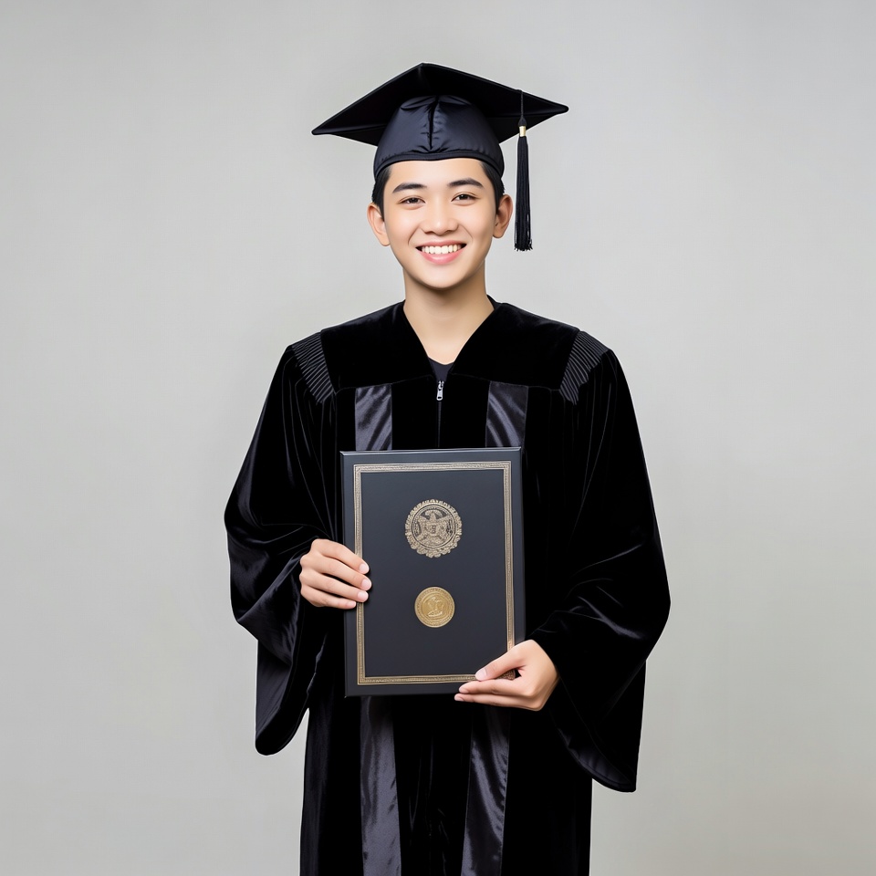 A young Asian boy wearing a black graduation cap and gown smiles happily while holding a black-framed diploma with a gold emblem. He stands against a plain gray background. The gown features velvet trim and the cap has a tassel.