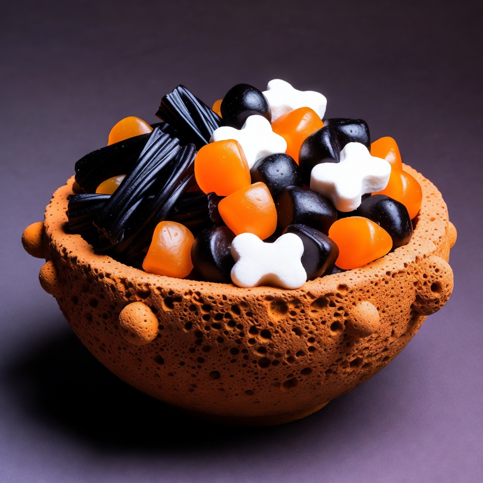 A terracotta bowl with textured spikes holds a colorful assortment of Halloween candies. The candies include black licorice twists, orange and black gumdrops, and white bone-shaped gummies. The bowl sits on a dark purple background.