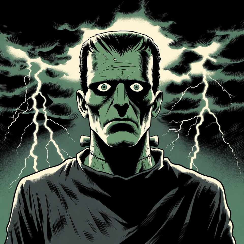 A green-skinned Frankenstein monster with stitched face and neck bolts stares forward intensely. He wears a dark shirt and stands against a stormy background with dramatic lightning bolts and clouds. The illustration features bold lines and a glowing halo effect behind his head.