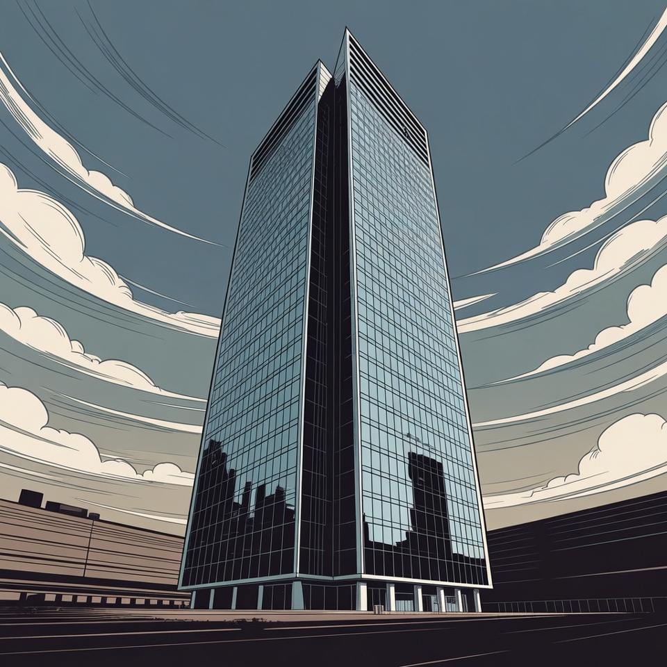 A modern tall skyscraper with reflective glass windows is depicted in a line art illustration style. Swirling clouds surround the towering structure, and its facade reflects surrounding city buildings and a bridge. The image uses bold black outlines and blue tones against an isolated background.