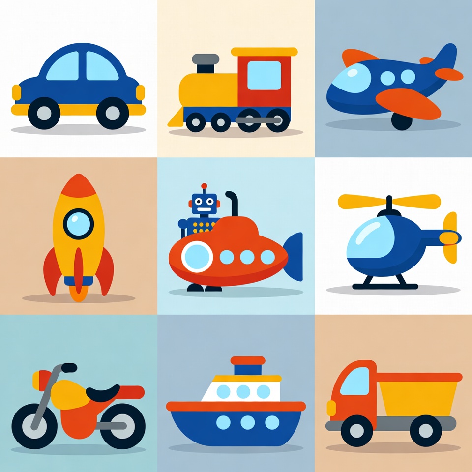 airplane, blue car, blue helicopter, blue ship, car, cartoon, colorful, dump truck, flat design, helicopter, illustration, isolated background, kids vehicles, motorcycle, orange motorcycle, orange rocket, orange truck, robot, rocket, ship, submarine, train, transportation, vehicles, yellow train, clipart