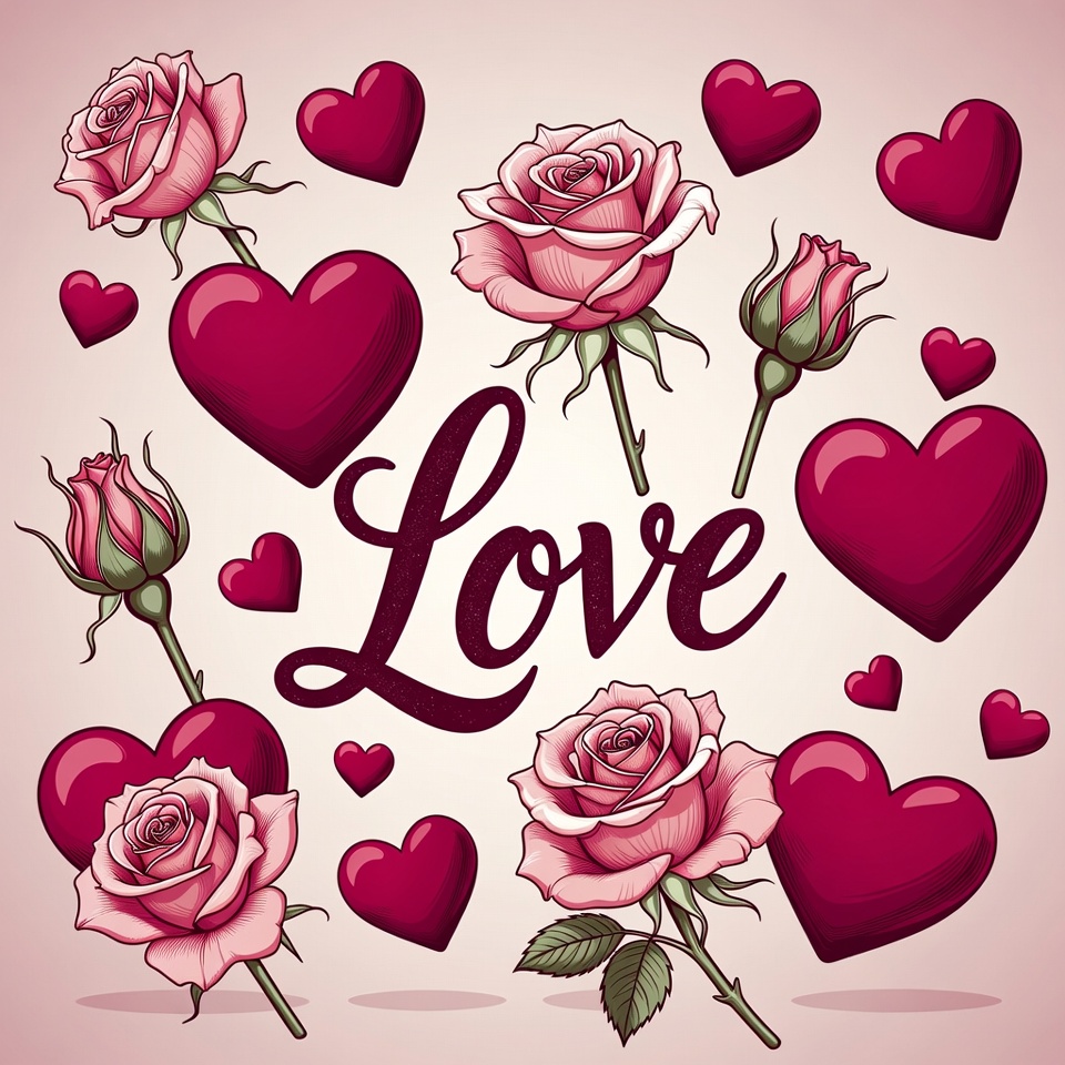 A digital illustration features the word 'LOVE' in elegant cursive script surrounded by pink roses, rosebuds, and red hearts. The elements are arranged on a light pink background with subtle shadows for depth. Various roses with stems and leaves float around the central text.