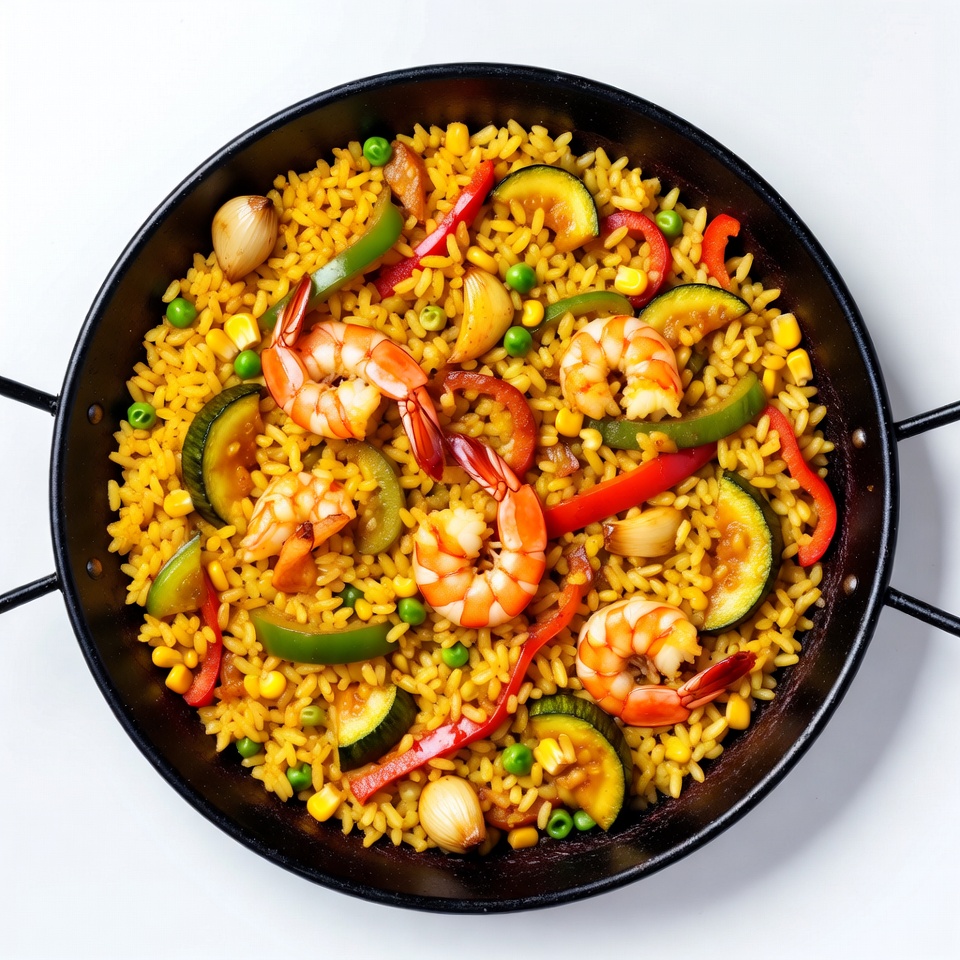 A black paella pan filled with saffron rice, large pink shrimp, sliced zucchini, red and green bell peppers, peas, corn, and garlic sits on a white background. The dish is viewed from directly above, showcasing the vibrant colors and fresh ingredients evenly distributed. Handles extend from the sides of the pan.