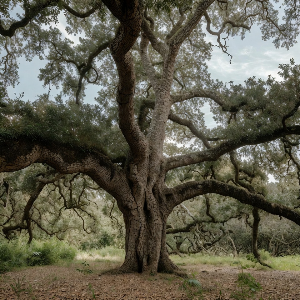 ancient tree, bark texture, clouds, earthy ground, environment, field, foliage, grassland, green leaves, landscape, large tree, majestic oak, nature, outdoors, sky, tree trunk, twisting branches, vegetation, woodland, oak tree