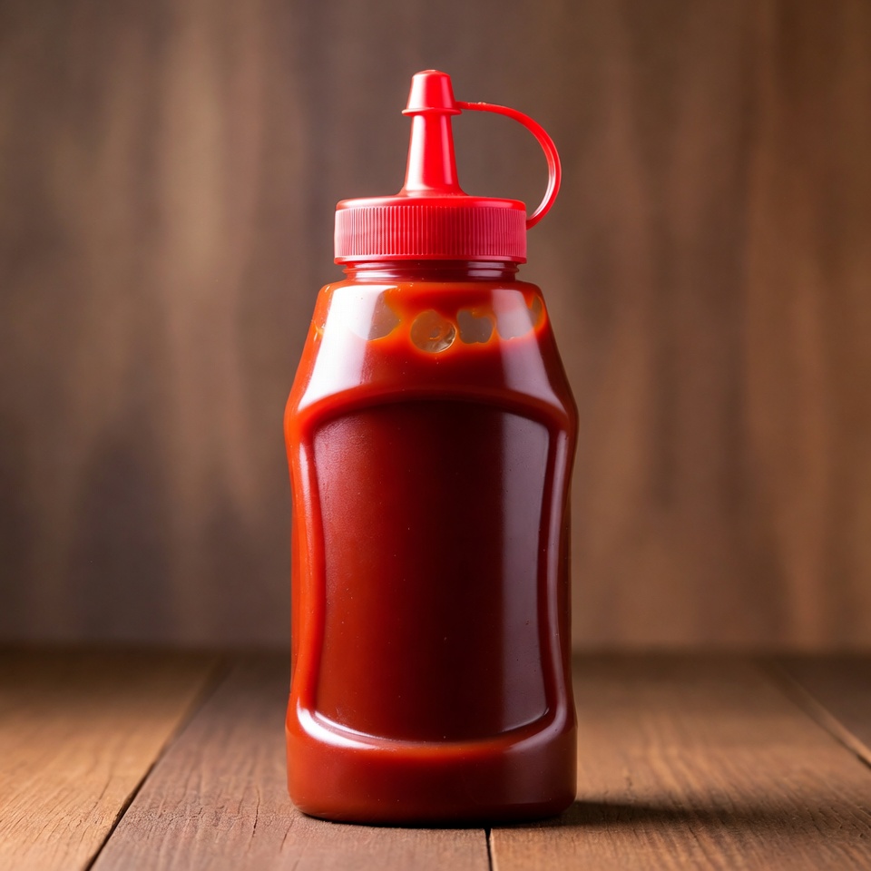 bbq sauce, condiment, dining, food sauce, isolated, ketchup, kitchen, plastic bottle, product photo, red bottle, red cap, sauce bottle, squeeze bottle, tomato ketchup, wooden background, ketchup bottle