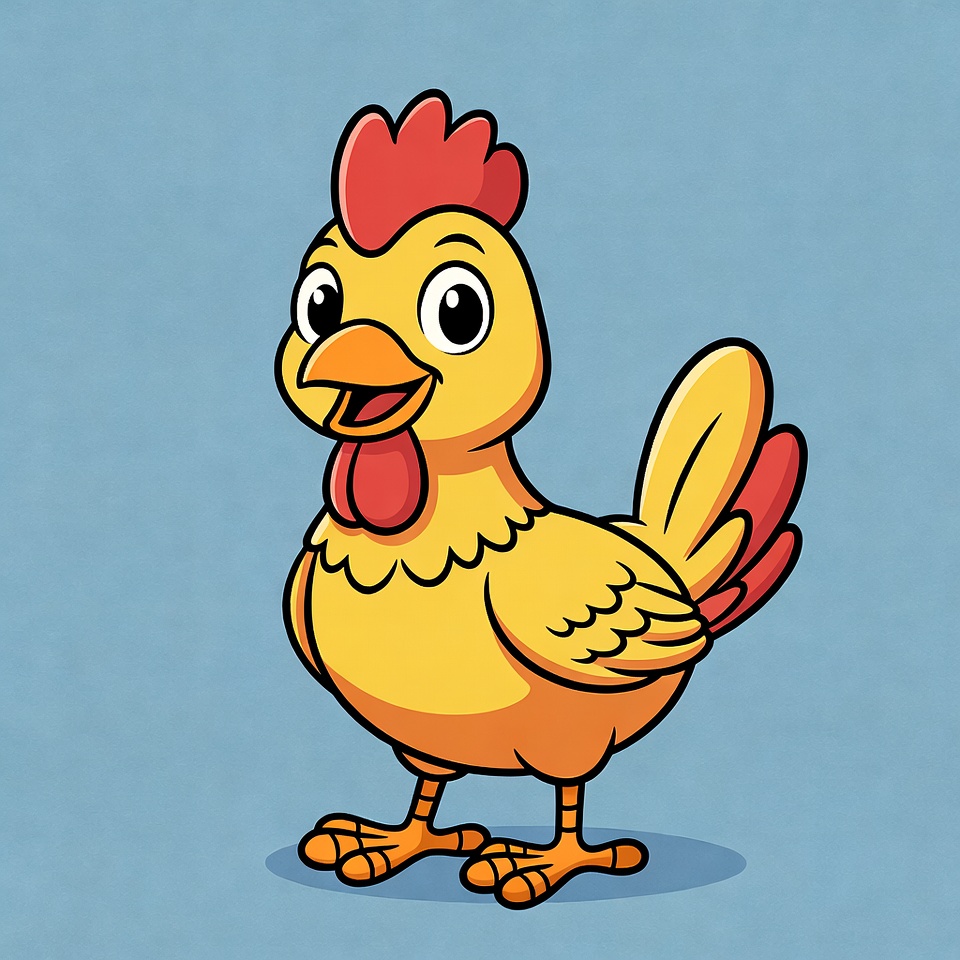 animated chicken, big eyes, chicken, clipart, cute animal, farm animal, illustration, isolated background, poultry, red comb, smiling rooster, yellow rooster, cartoon rooster