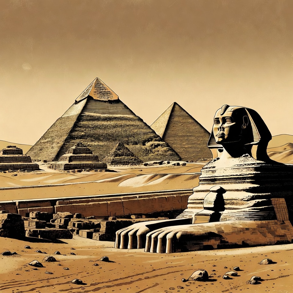 Egypt, Egyptian landmarks, Giza pyramids, Great Sphinx, ancient Egypt, ancient architecture, ancient ruins, camel, desert, historical site, illustration, monumental statues, pyramids, ruins, sand dunes, sandy landscape, sepia tones, Sphinx