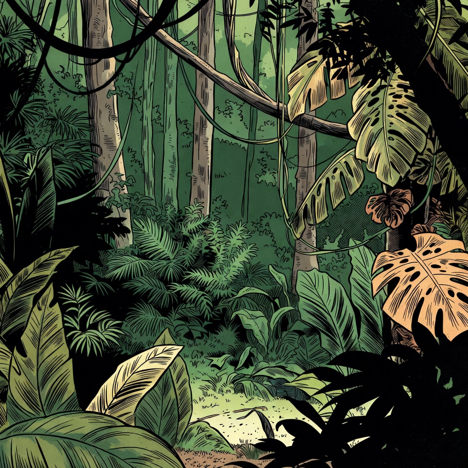 A detailed black ink illustration depicts a dense tropical jungle with tall trees, thick vines hanging from branches, and large green leaves. Sunlight filters through the canopy, highlighting ferns, broad-leaf plants, and a small path in the foreground. The artwork features intricate line work and varying shades of green.