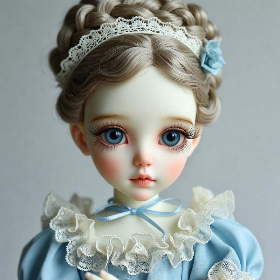 Asian, Victorian dress, ball jointed doll, blonde hair, blue dress, blue eyes, braided hair, doll, doll portrait, illustration, isolated background, lace dress, lace headband, pink rose, porcelain skin, ribbon bow, ruffled collar, updo hairstyle, woman, BJD doll