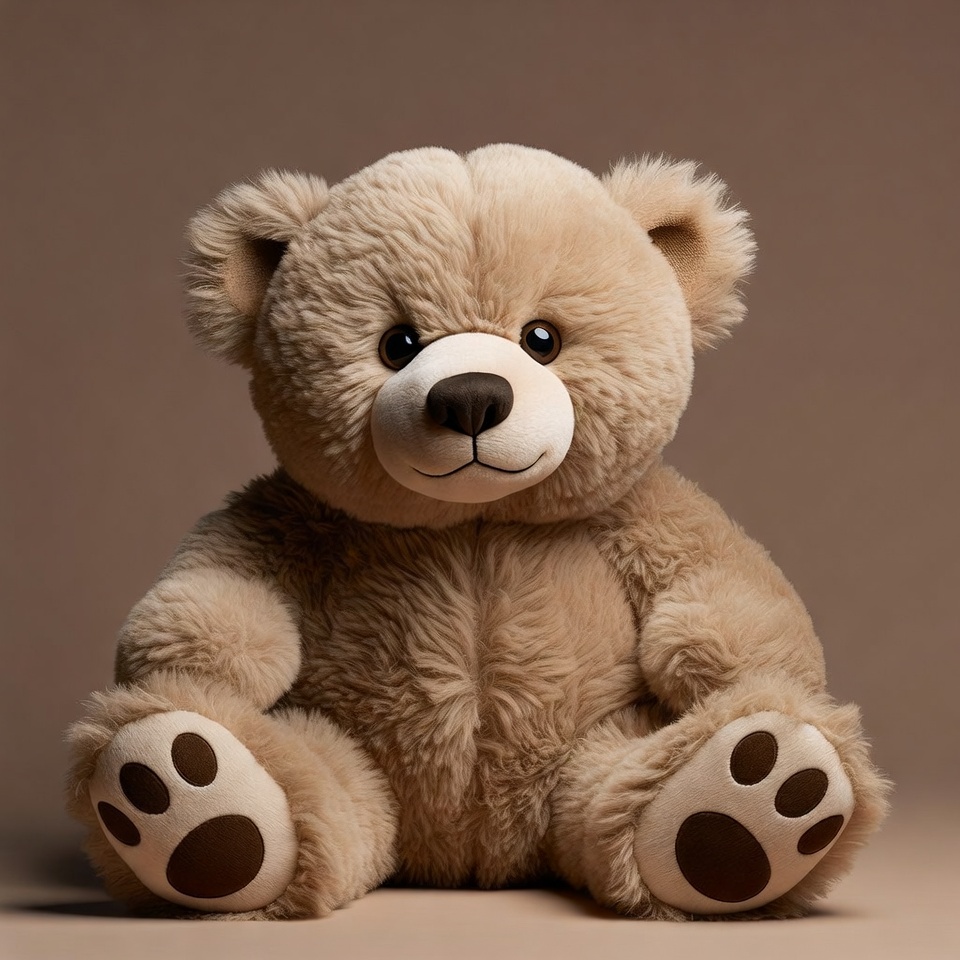 A plush teddy bear with light brown fur sits on a neutral background. It has large black eyes, a small black nose, and shiny black paw pads. The bear's soft fur and friendly expression make it endearing.