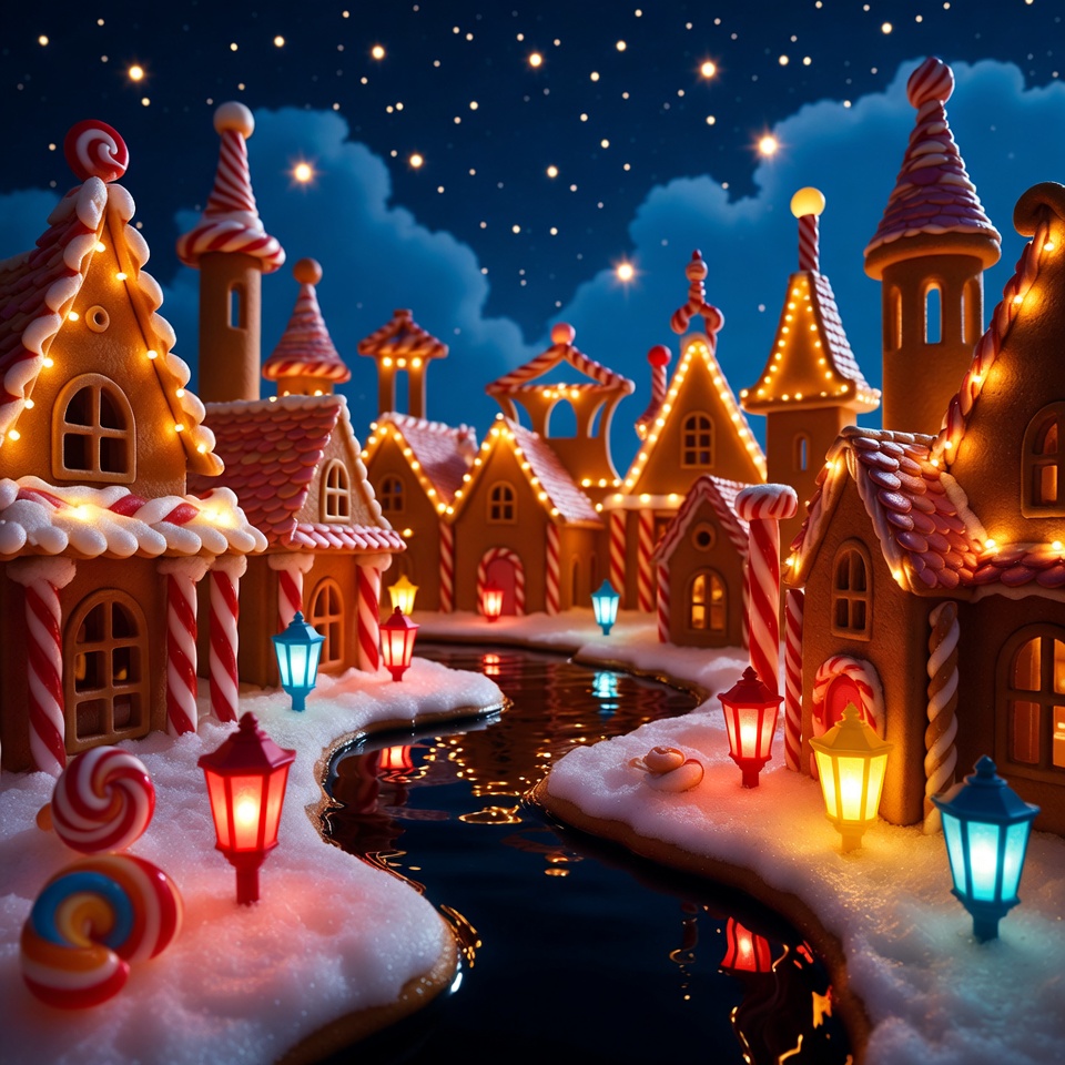 A whimsical gingerbread village features candy cane houses with icing roofs and gumdrop decorations under a starry night sky. A sparkling stream winds through the snowy scene, illuminated by colorful candy lanterns. The fairy-tale landscape glows with festive lights and sugary details.