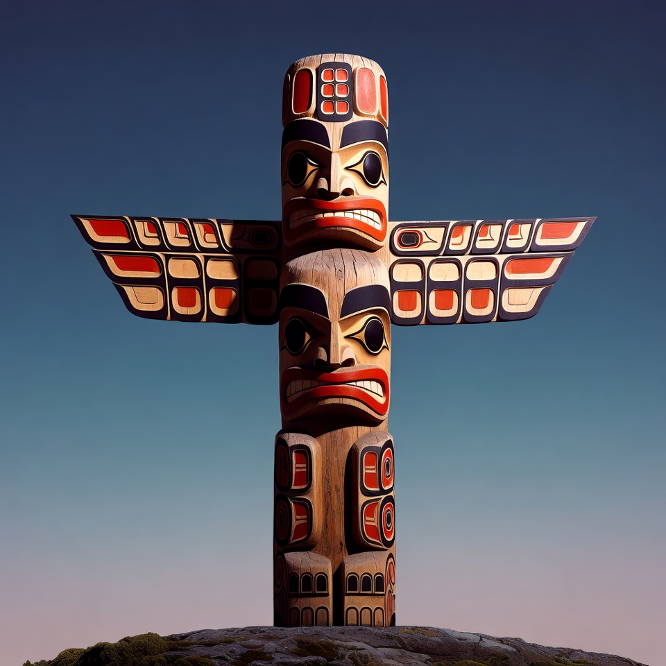 Haida, Indigenous art, Native American, Northwest Coast, Pacific Northwest, Tlingit, blue sky, carved faces, cultural heritage, cultural symbol, eagle, fierce expressions, isolated background, red designs, rocky base, stacked figures, traditional art, tribal sculpture, wooden carving, totem pole