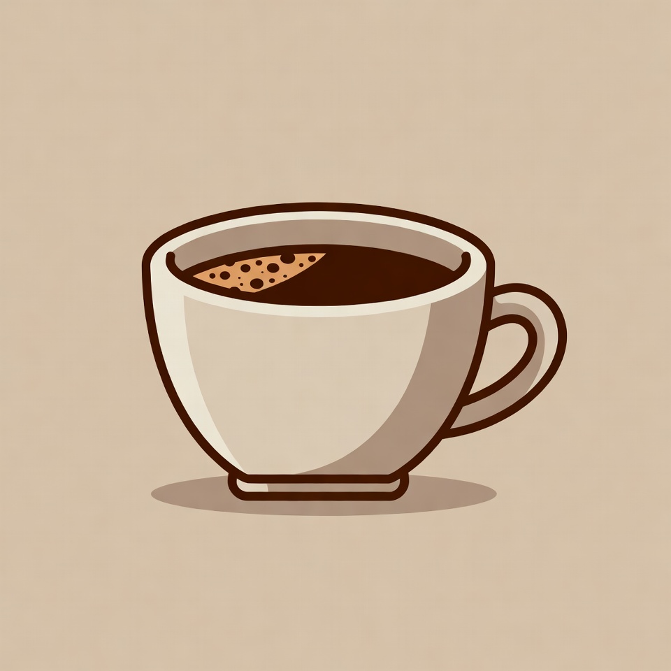 A simple illustration of a white ceramic coffee cup filled with dark coffee and topped with creamy beige foam. The cup features a smooth handle and subtle shadow on a plain beige background. The design is clean and flat with bold outlines.