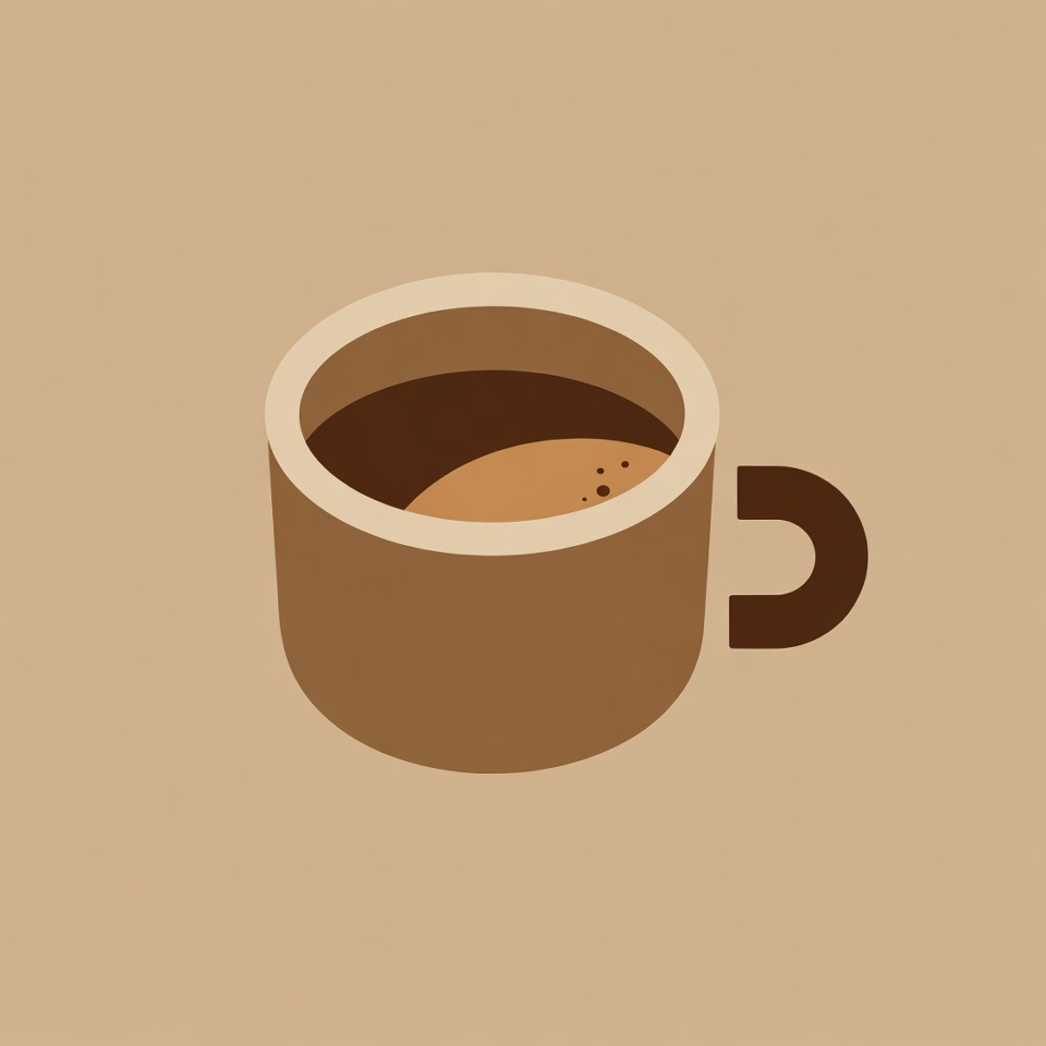 A simple illustration of a brown ceramic coffee cup filled with dark coffee and topped with creamy foam. The cup features a prominent handle and sits on a solid beige background. Fine details like foam bubbles are visible on the surface.