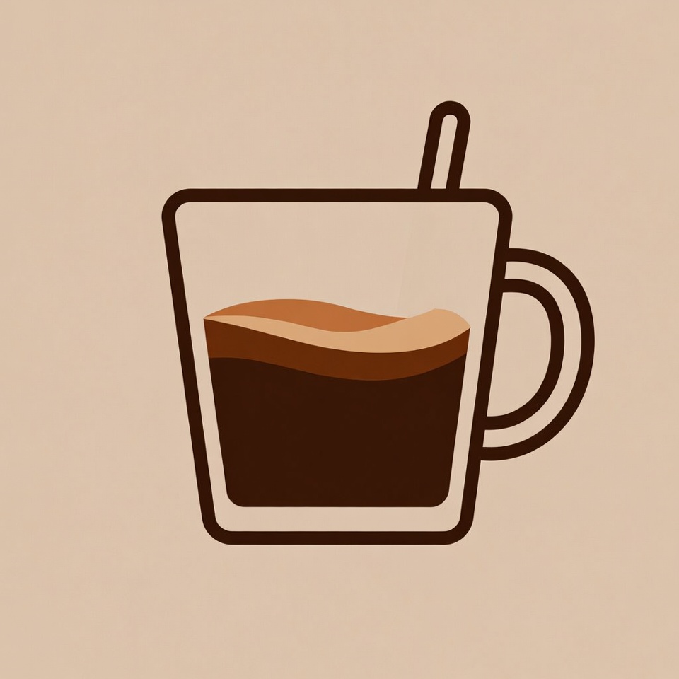A simple line art illustration of a clear glass mug filled with dark coffee and topped with creamy foam. A thin black stirrer protrudes from the cup. The design features clean outlines on a beige background.