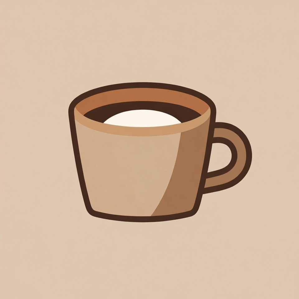 A simple illustration of a beige ceramic mug filled with coffee topped by white foam. The mug features a curved handle and sits on a solid beige background. The design is clean and minimalist in a cartoon style.