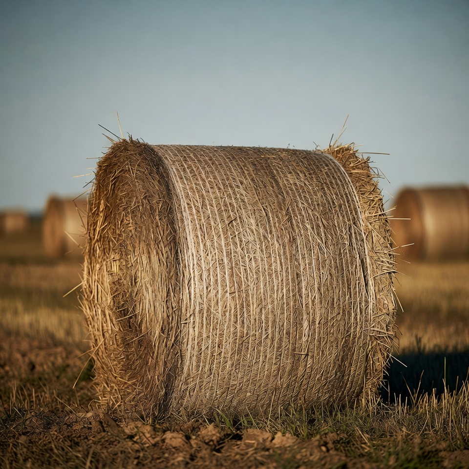 Large round hay bales wrapped in netting stand in a dry grassy field under a clear blue sky. Several bales are scattered in the background with golden grass and dirt around them. The scene captures a rural agricultural landscape at harvest time.