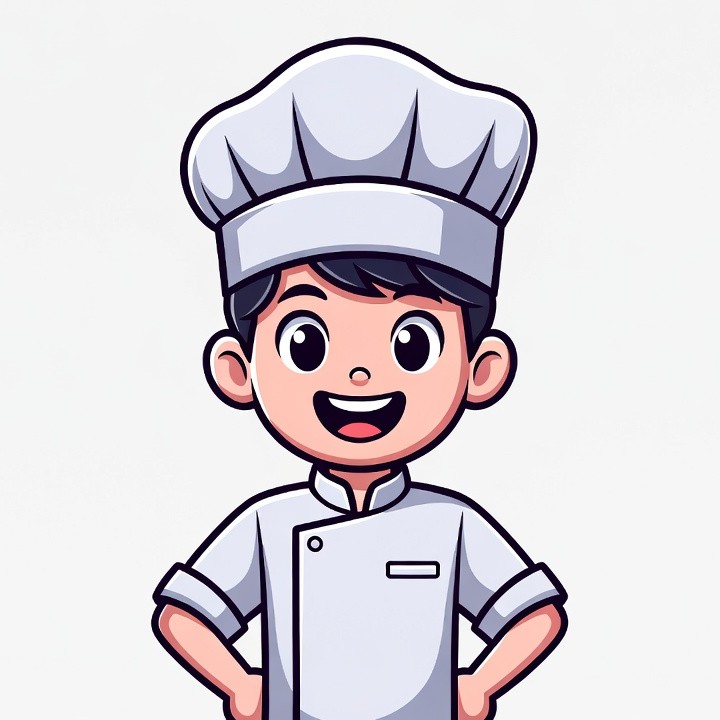 A cute cartoon boy with short black hair wears a tall white chef's hat and matching chef uniform. He stands confidently with hands on hips and a big smile on his face. The illustration features bold outlines and is set against a plain white background.