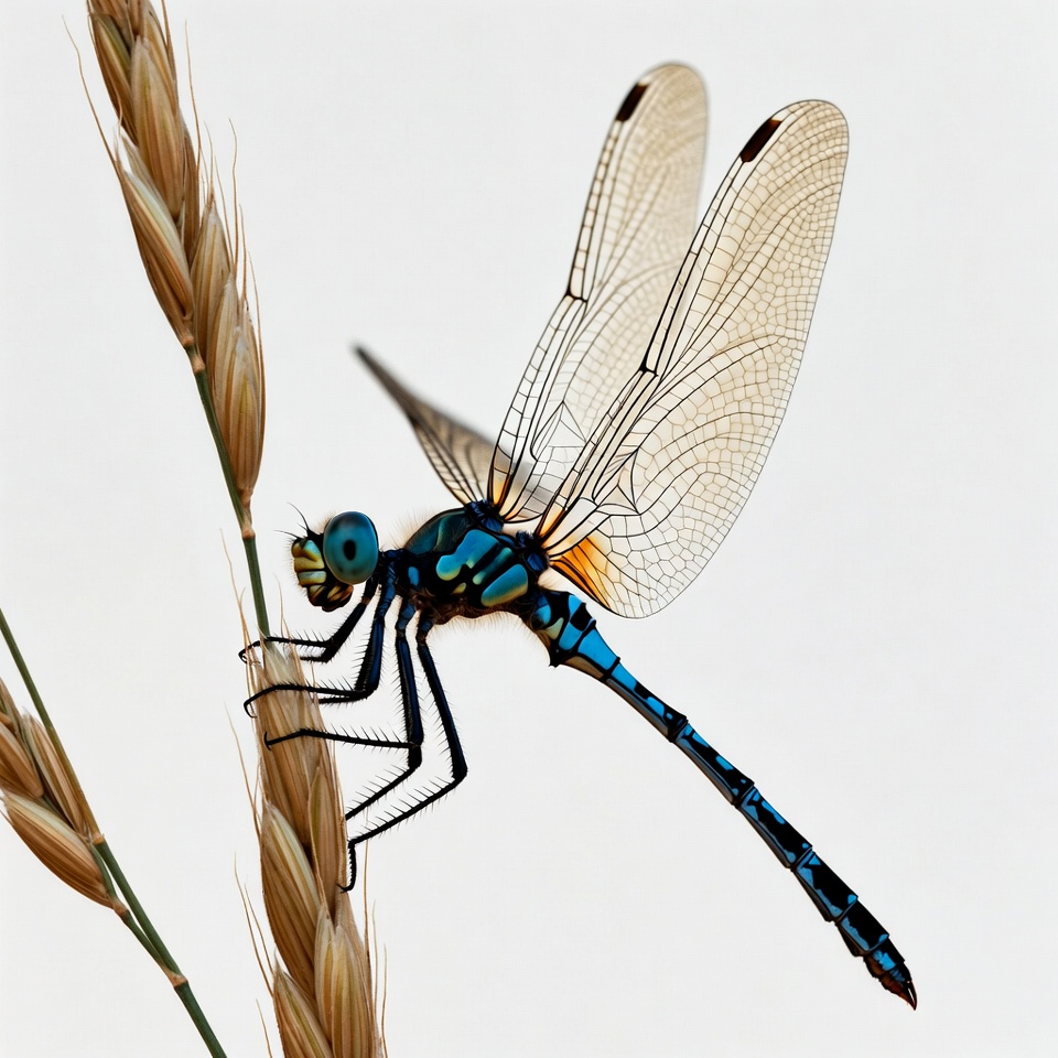 A vibrant blue dragonfly with intricate wing patterns perches on a tall wheat stalk. Its body features green and orange markings, and its large eyes are prominently visible. The wings are transparent with black veins, set against a white background.