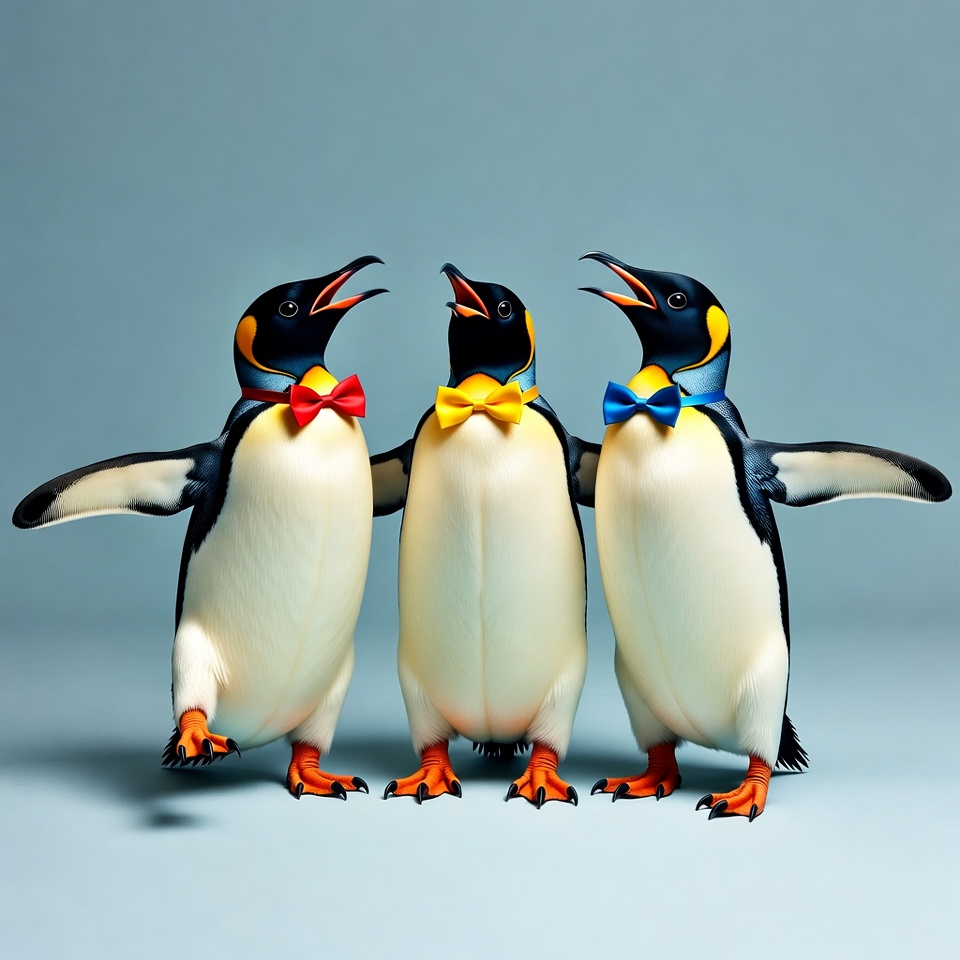 Three emperor penguins stand together on a light blue background, each wearing a different colored bow tie: red, yellow, and blue. They have their wings spread out and beaks open as if singing or calling. Their glossy black and white feathers shine under the light.