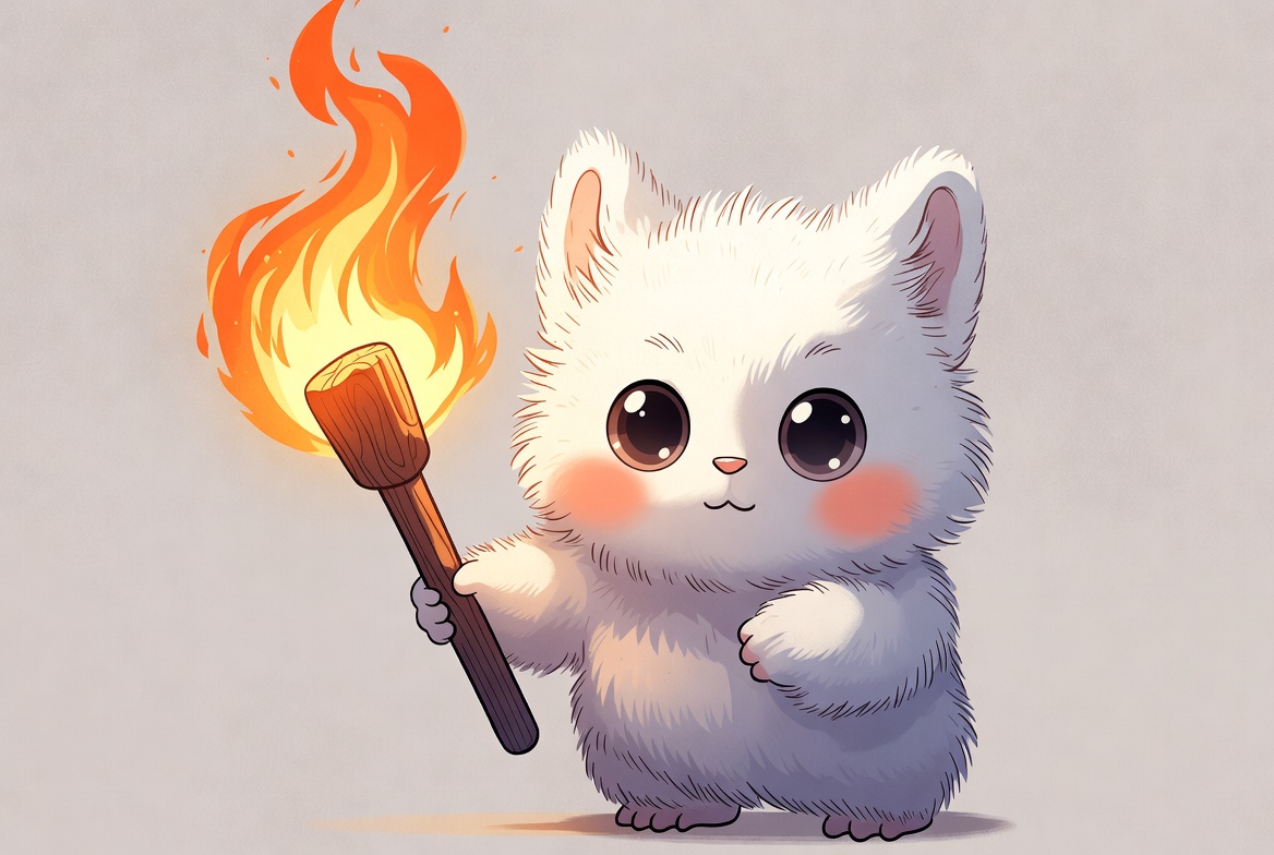 An adorable chibi-style white kitten with large expressive eyes holds a lit wooden torch with bright orange flames. The fluffy cat stands on a plain light gray background, gripping the torch handle with its tiny paws. The illustration features soft shading and cute blush marks on the kitten's cheeks.