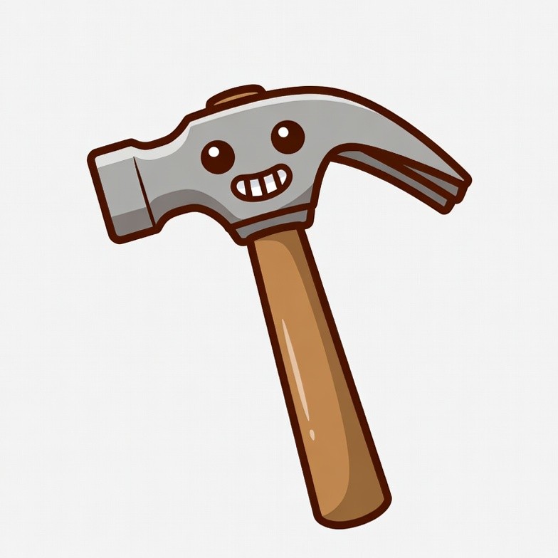 anthropomorphic, big eyes, cartoon hammer, clipart, construction tool, cute hammer, emoji style, funny hammer, gray hammer, happy face, illustration, isolated background, kawaii, playful, silver head, smiling hammer, tool, vector, wooden handle, hammer