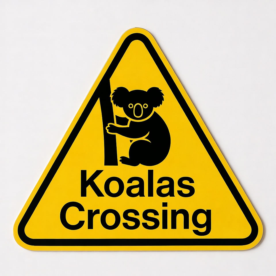 animal sign, australia, black silhouette, isolated background, koalas crossing, marsupial, road sign, safety sign, silhouette koala, tree trunk, triangular sign, warning sign, wildlife crossing, yellow sign, koala