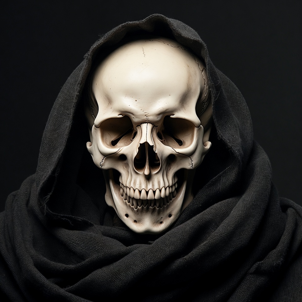 A realistic human skull with a dark hooded cloak draped over it is centered against a black background. The skull features detailed bone structure, empty eye sockets, nasal cavity, and grinning teeth. The hood frames the skull closely, creating a dramatic and ominous appearance.