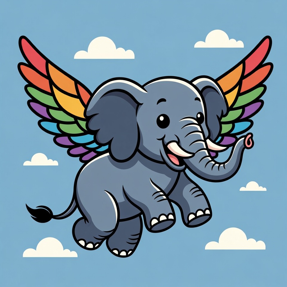 Cartoon elephant with rainbow wings flying
