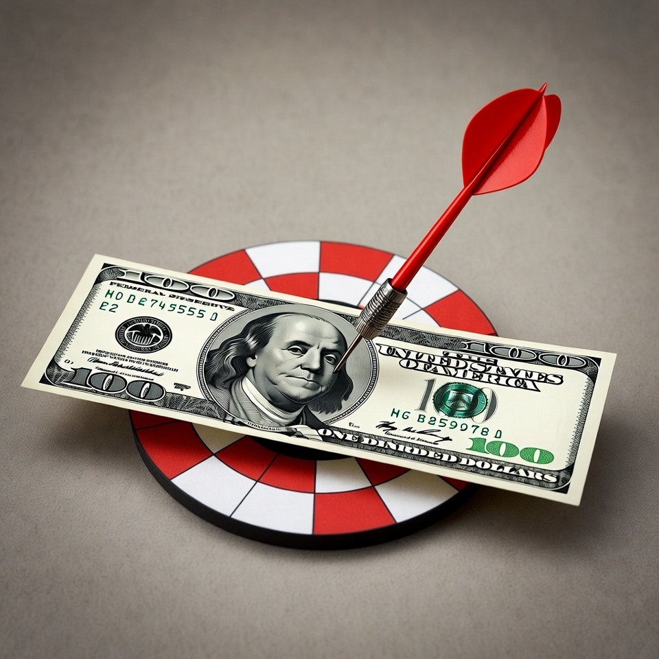 $100 bill, Benjamin Franklin, US dollar, bullseye, cash, currency, finance, financial target, hitting target, hundred dollar bill, isolated background, money, red dart, success, target, wealth, dart