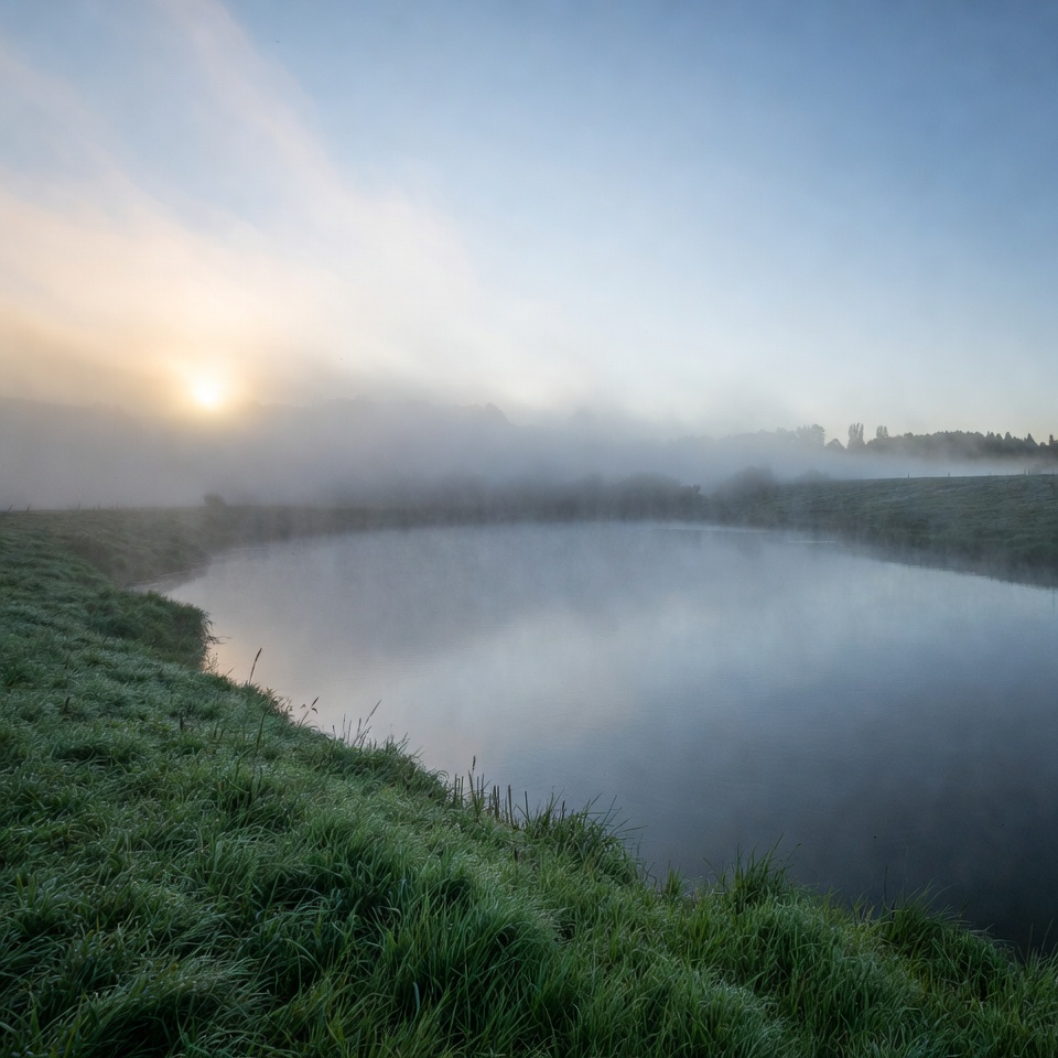 A serene sunrise casts golden light over a misty pond surrounded by green grassy fields. Thick fog blankets the landscape, with the sun partially obscured by clouds and mist. Reflections shimmer on the calm water surface.