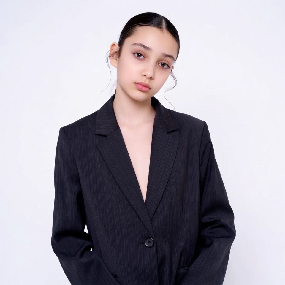 A young Asian girl with dark hair in a ponytail stands against a white background. She wears a black pinstripe blazer with a deep V-neckline and has a neutral expression. Her hair is styled with loose strands framing her face.