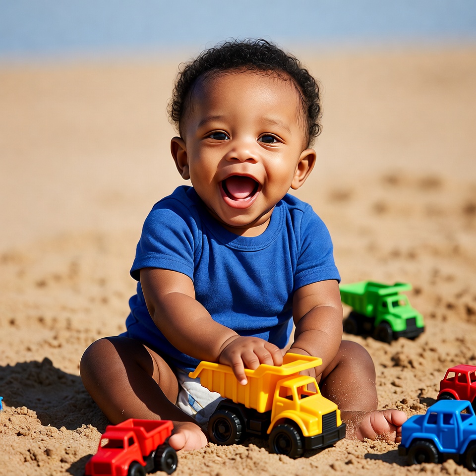 A smiling African-American baby boy with curly black hair sits in the sand on a sunny beach, wearing a blue onesie. He holds a yellow toy dump truck while surrounded by colorful toy trucks including red, green, and blue ones. The baby laughs joyfully amid the beach sand and toys.