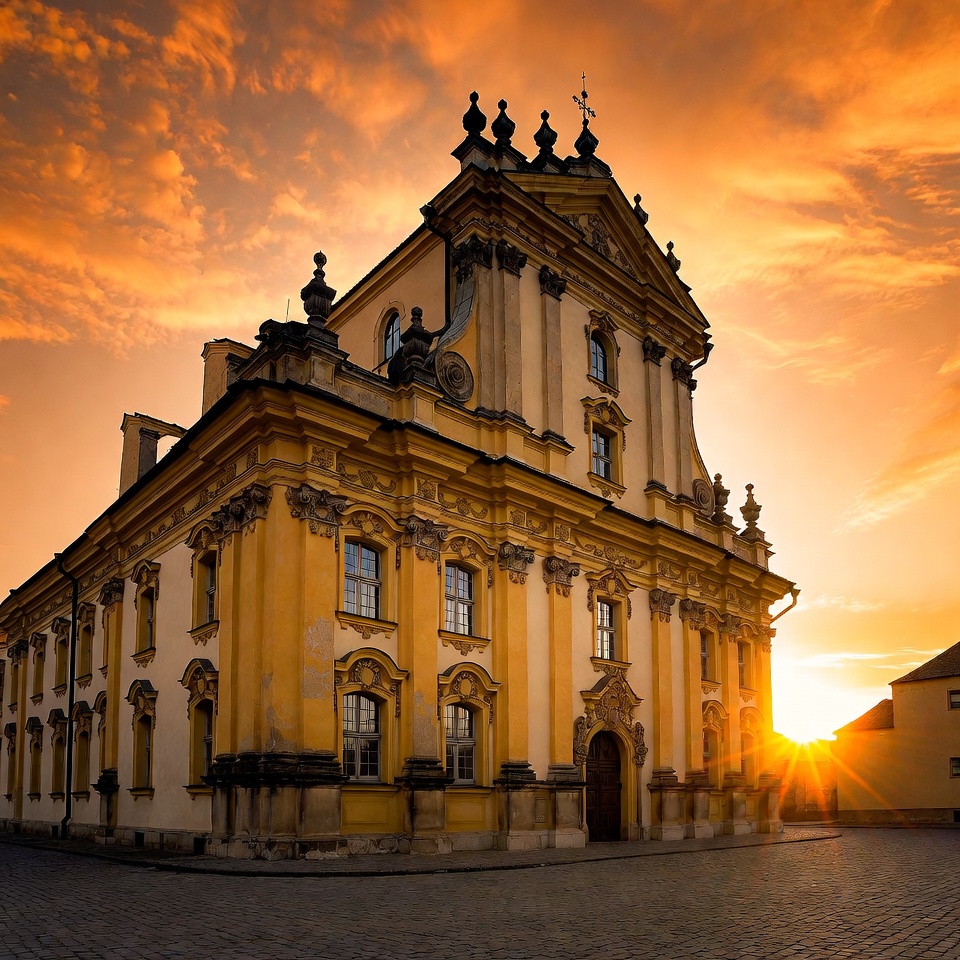 A historic yellow Baroque church with ornate facades and towers stands prominently against a vibrant orange sunset sky. The building features intricate architectural details, arched windows, and a large entrance door. Cobblestone pavement surrounds the church base with sunlight rays piercing through the clouds.