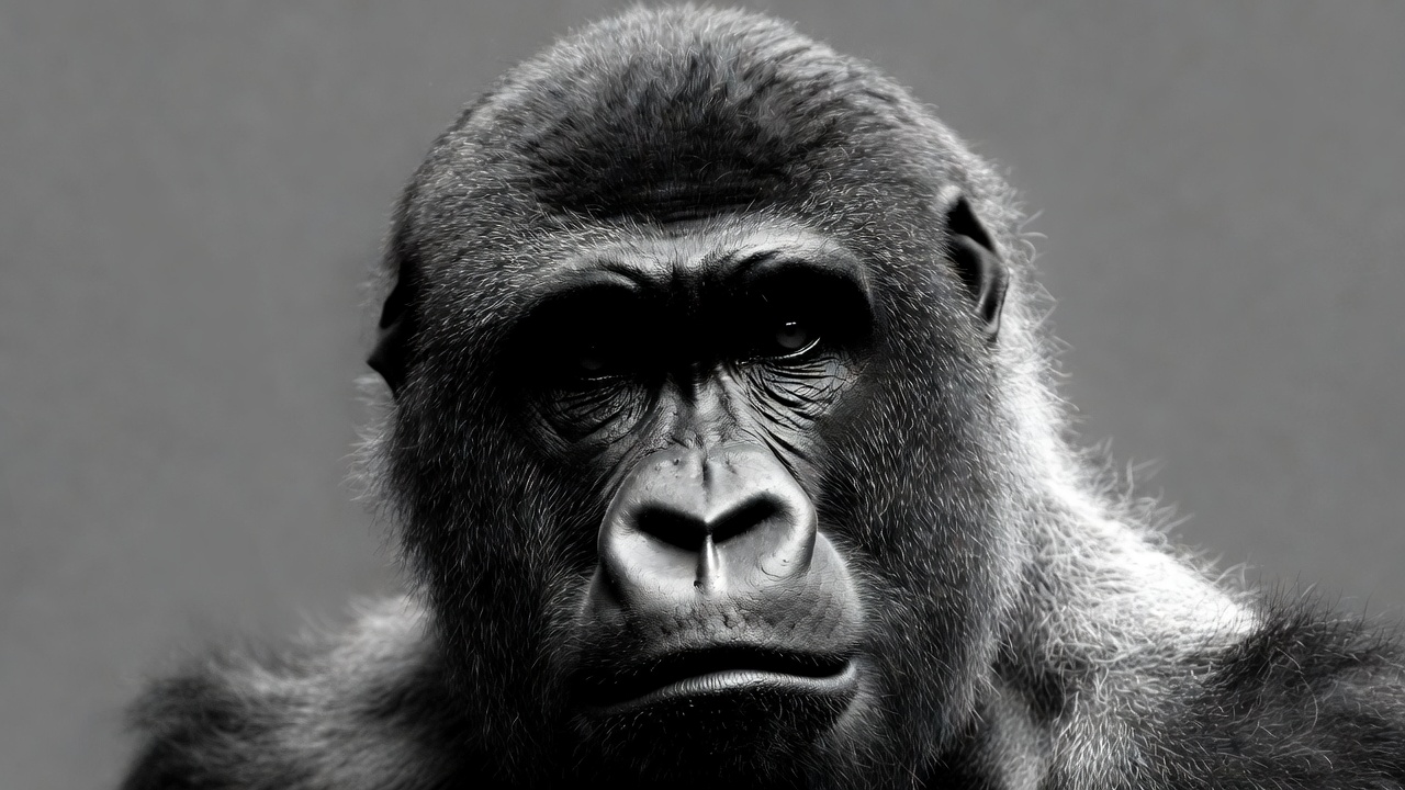 animal, ape, black and white, close-up, eyes, face, fur, intense gaze, mammal, monochrome, nose, portrait, powerful, primate, serious expression, silverback gorilla, wild animal, wildlife, zoo animal, gorilla