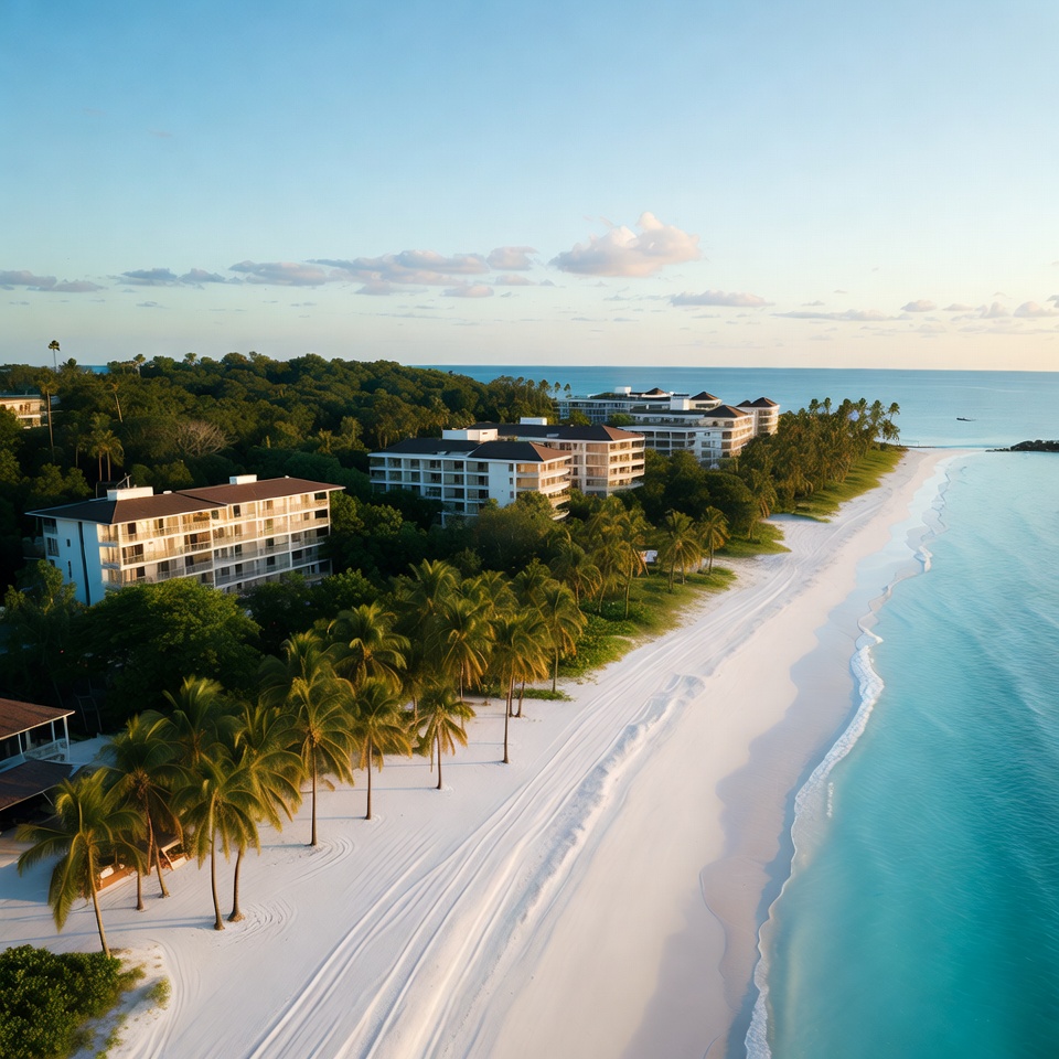 Caribbean, beach, buildings, clouds, coastline, drone shot, green vegetation, idyllic beach, island resort, luxury hotel, multi-story, ocean, palm trees, paradise, resort, seaside, sunset sky, travel destination, tropical, turquoise water, vacation, white sand, aerial view