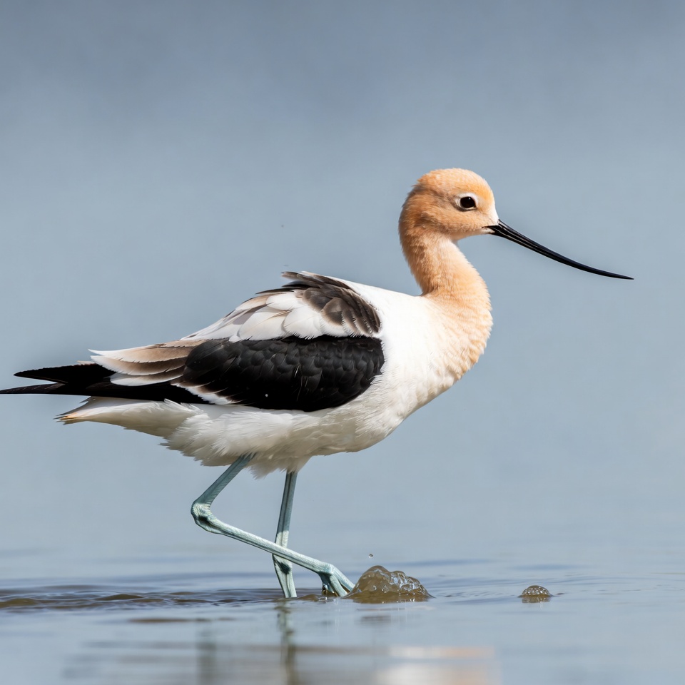 A black-necked stilt wades in shallow water with its long pink legs. The bird features a peach-colored head, long black bill, black wings, and white underparts. It stands on a blue background with subtle reflections.