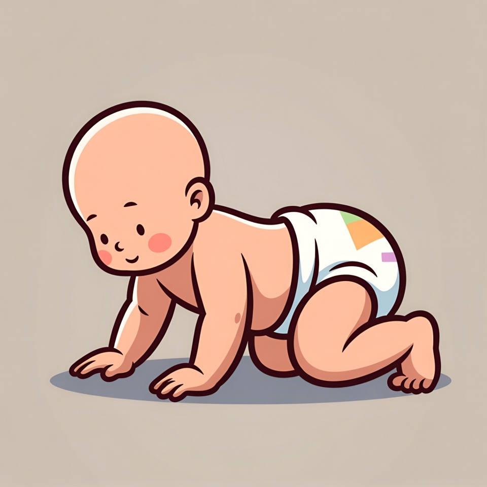A cute cartoon baby with a bald head and rosy cheeks crawls on the floor. The baby wears a white diaper with colorful patches and has a cheerful expression. The illustration features bold outlines on a light gray background.