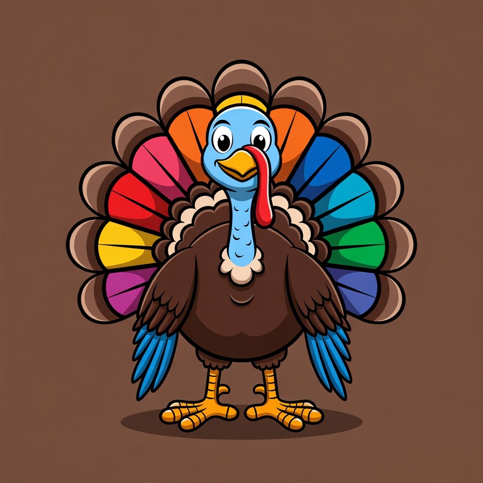 Cartoon Turkey with Rainbow Feathers