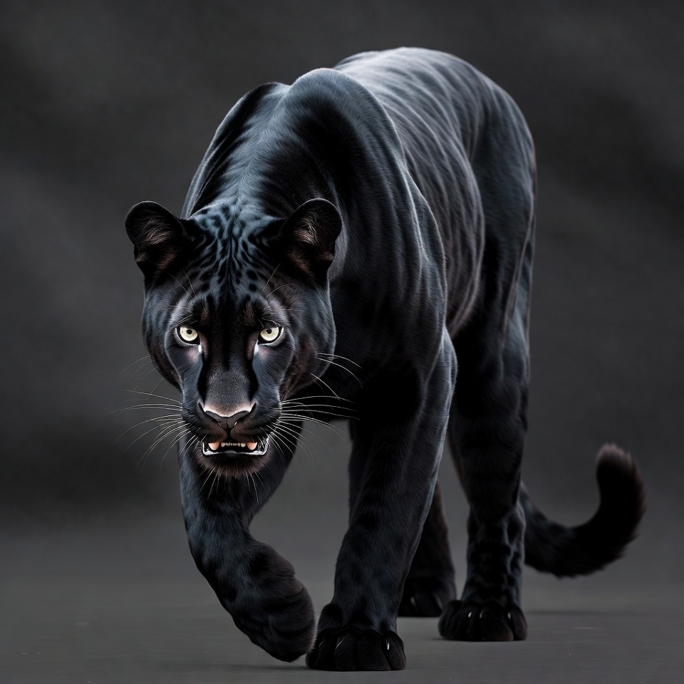 A sleek black panther with glossy fur prowls forward on a dark gray background. Its intense green eyes stare directly ahead, with bared fangs and muscular legs in motion. The tail curves behind as it moves with predatory grace.