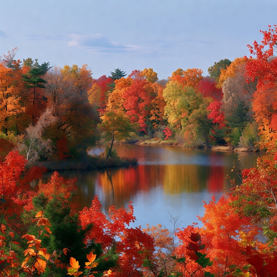 autumn colors, blue sky, colorful trees, deciduous trees, fall foliage, fall scenery, forest, island, lake, maple trees, nature, orange leaves, red leaves, reflection, scenic landscape, trees, vibrant leaves, water, wooded shore, woods, yellow leaves, autumn