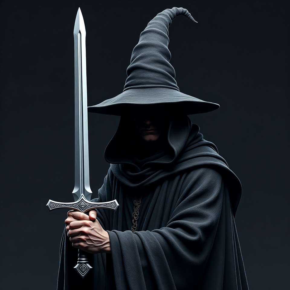 A male wizard in a dark hooded cloak and tall pointed hat stands holding a large silver sword with a crossguard. His face is partially shadowed by the hood, and he grips the sword with both hands. The figure is rendered in a realistic 3D style against a black background.