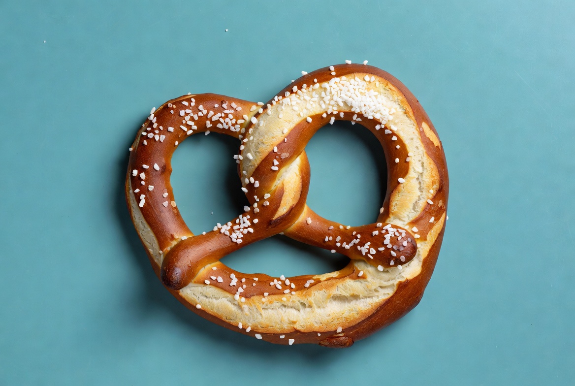baked pretzel, blue background, food photography, fresh pretzel, german pretzel, golden pretzel, isolated pretzel, pretzel knot, salt crystals, salted pretzel, snack food, soft pretzel, top view, twisted pretzel, pretzel