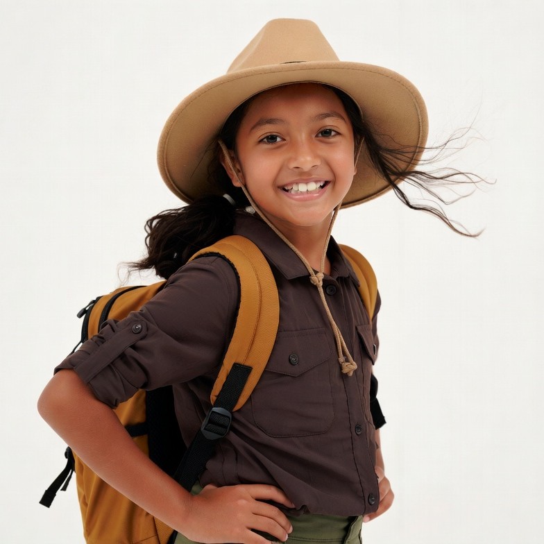 A young Asian girl with long dark hair smiles while wearing a beige wide-brim hat, brown collared shirt, green pants, and a yellow backpack. She stands confidently with hands on hips against a white background. Her hair flows slightly to one side.